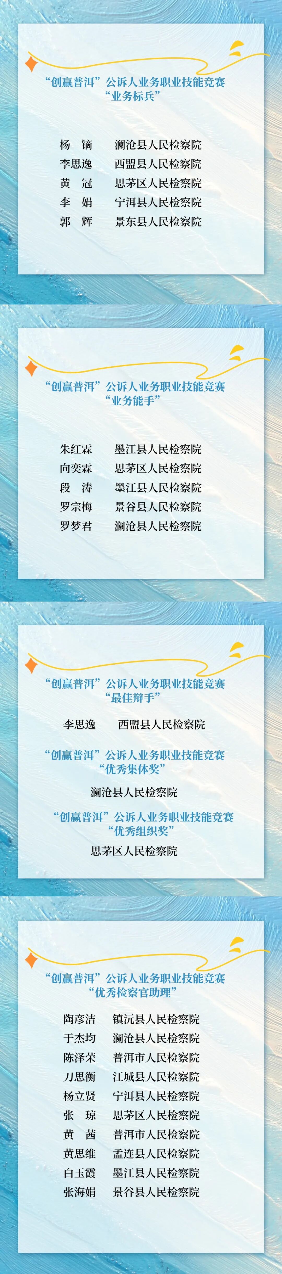 经过激烈角逐,澜沧县院杨镝等5名选手荣获“创赢普洱”公诉人业务职业技能竞赛“业务标兵”称号,墨江县院朱红霖等5名选手荣获“业务能手称号”,镇沅县院陶彦洁等10名选手荣获“优秀检察官助理”称号。西盟县院李思逸、澜沧县院、思茅区院分别荣获“创赢普洱”公诉人业务职业技能竞赛“最佳辩手”“优秀集体奖”“优秀组织奖”等单项奖。